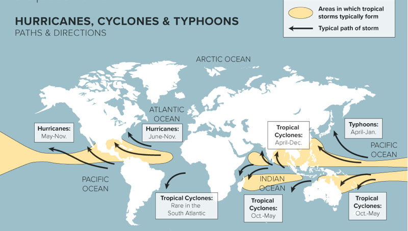 In the South Pacific and Indian Ocean, the generic term tropical cyclone is used